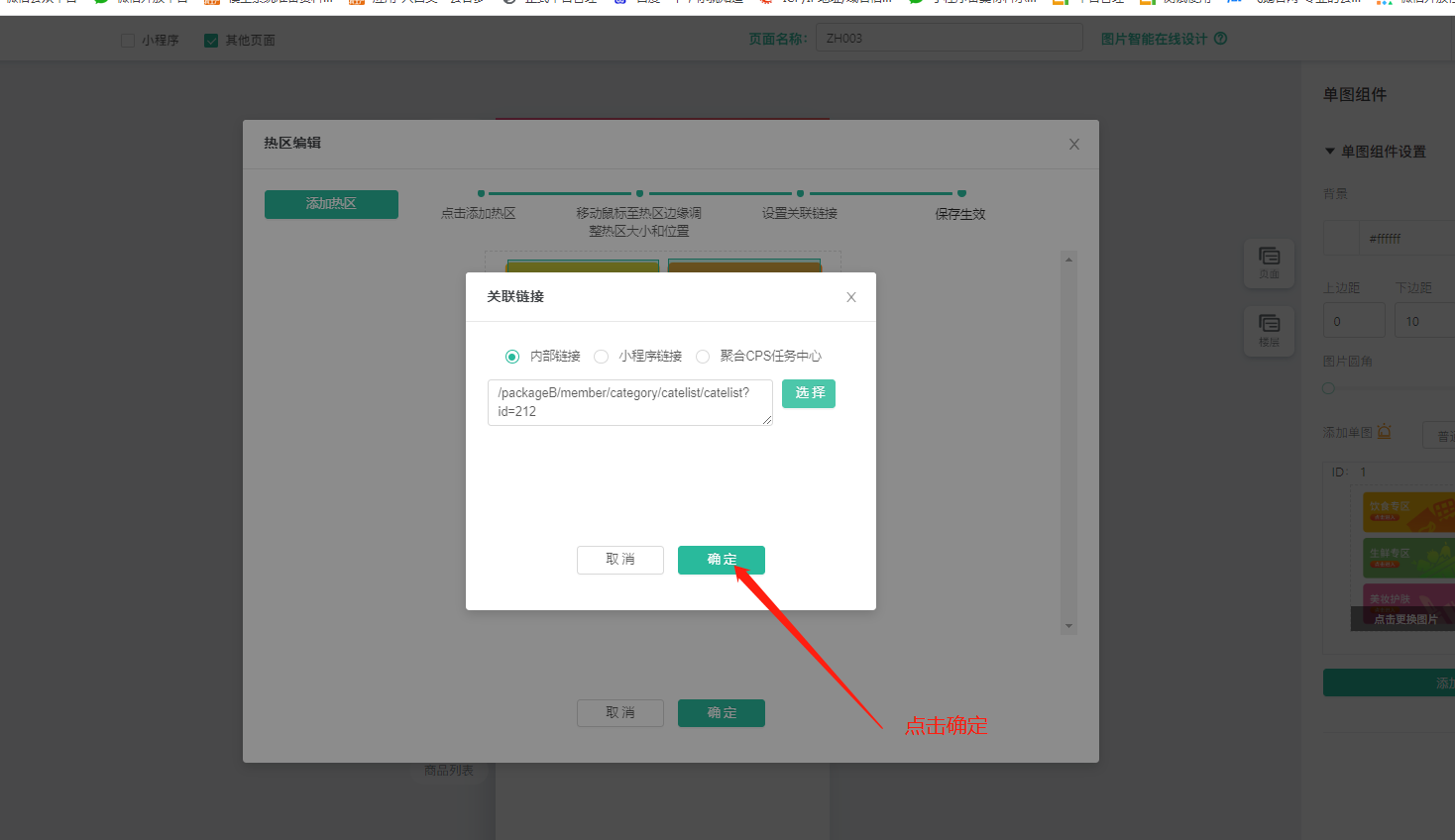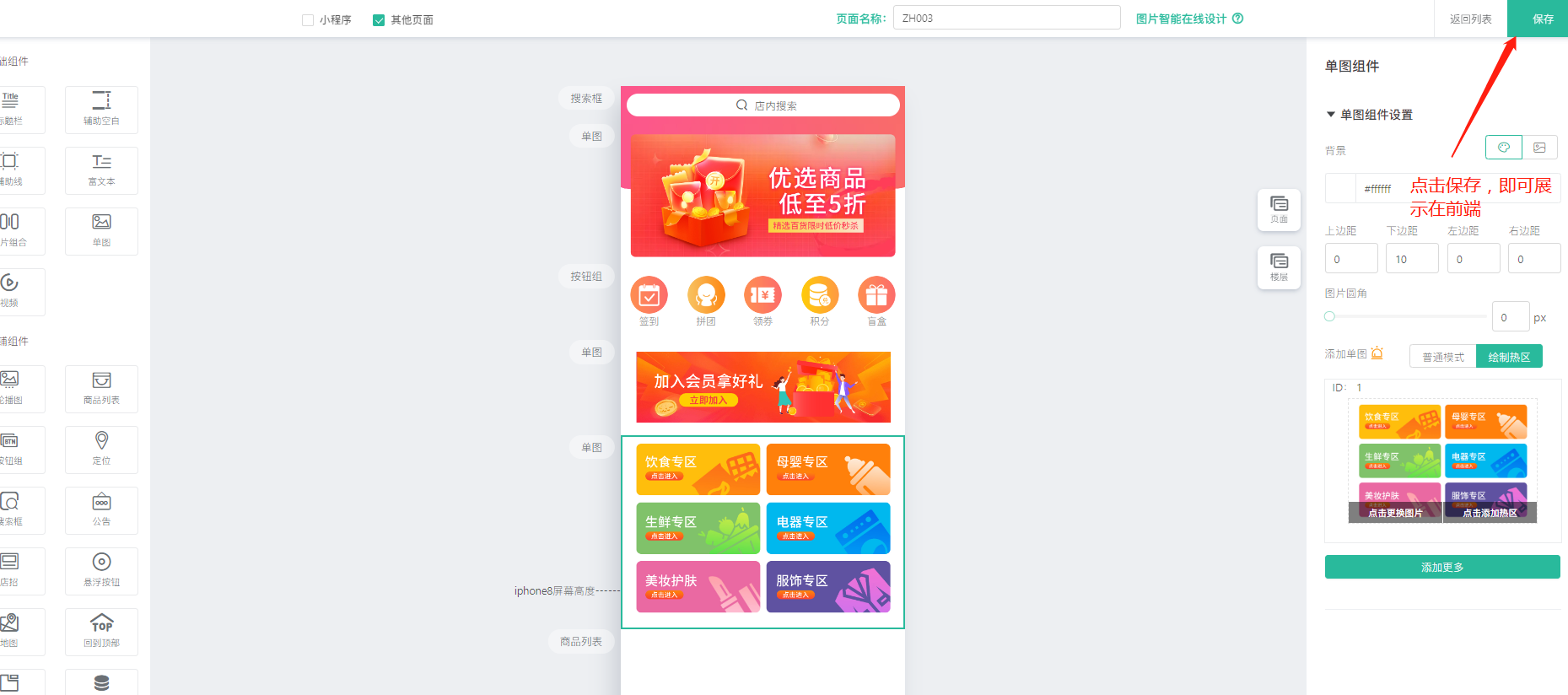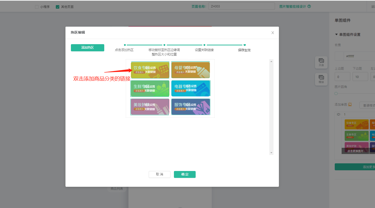 ⑧、第三种方法,可以拖动单图,上传设计好的单图,如果这张单图有多个专区,可以绘制热区,选择对应的商品 分类