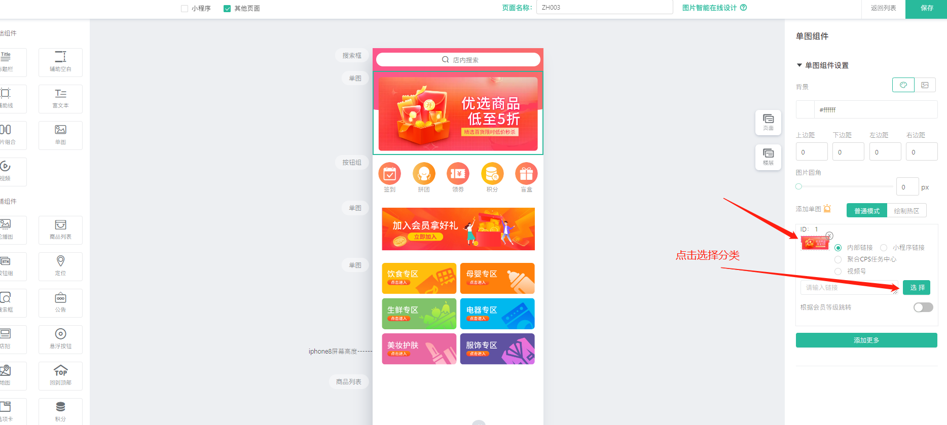 ⑨、如果单图是一个商品分类的,就直接选择链接,选择好后点击保存即可