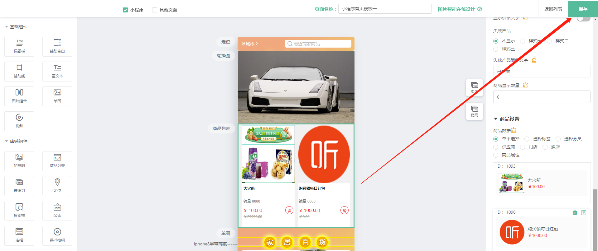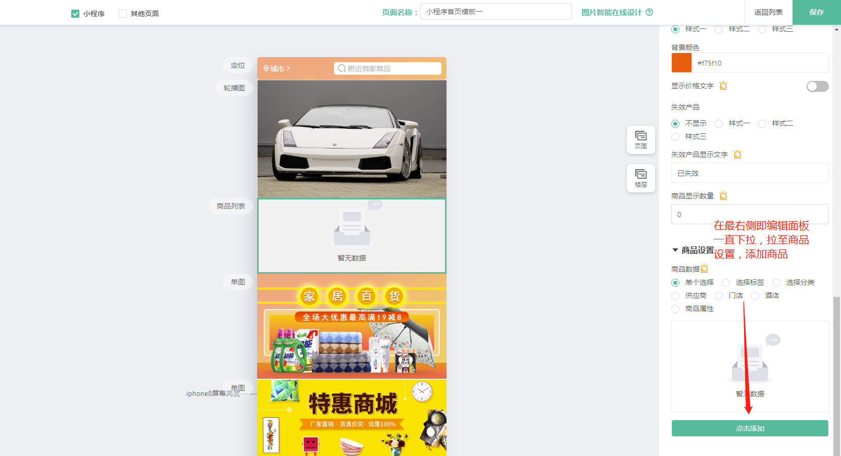 ②有三种方法可以展示前端,第一:拖拽左边组件:商品列表到中间首页模板的区域