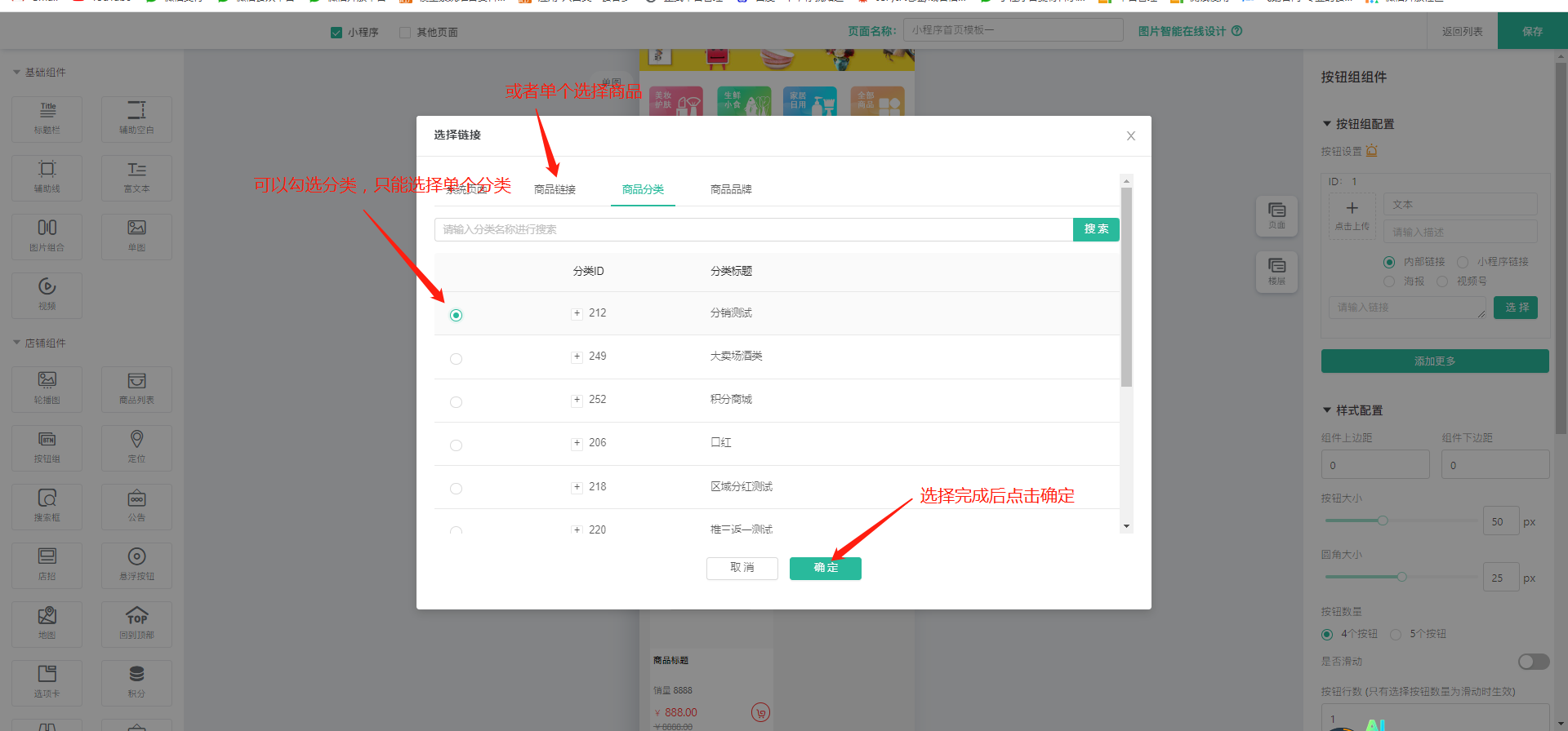 ⑦、第二种,可以拖动按钮组,按钮组这个可以选择商品的分类或者是创建商品的二级页面,把商品的二级页面链接粘贴到按钮组去,如何创建二级页面可以参考该文档:http://doc.yingzaizhijian.com:8181/docs/hzkfb20230620/hzkfb20230620-1fopv3knilj5m