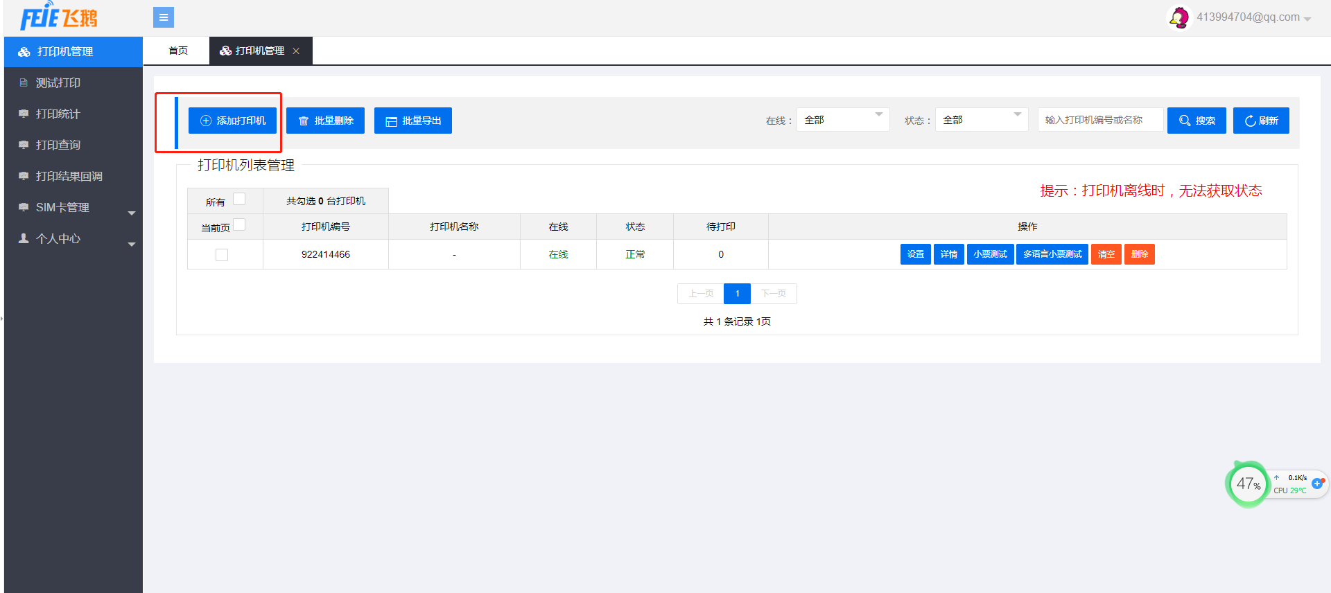二、注册完毕后选择-打印机管理-添加打印机-确认提交