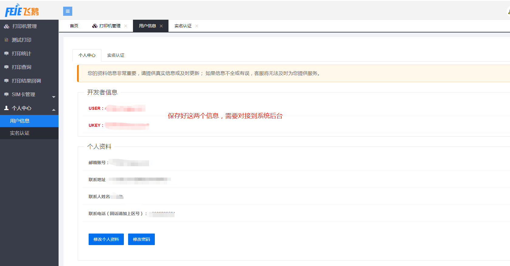 ②登录飞鹅平台,使用账号密码登录(购买飞鹅后会收到,或者可联系客服),在个人中心 -- 开发者信息 --查看USER、UKEY,并复制粘贴到后台打印机设置处。